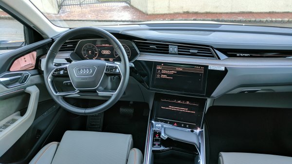 Нашият тестов е-tron, каран при температури около нулата и с постоянно включено отопление, даваше 250 километра обхват в началото. След около 90 километра тест (включително и газ до дупка на магистралата) накрая колата показваше още 180 километра пробег. Обяснението е в системата за рекуперация на енергията, която ползва и спирачките, и самите електромотори. В резултат e-tron възстановява значително повече заряд в батериите от всичките си конкуренти.