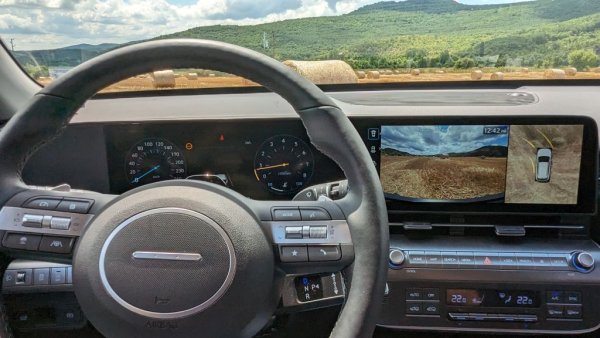 В сърцето на този интериор са двата 12-инчови дисплея, монтирани като един общ панел върху таблото - решение, което вече ни е добре познато от Ioniq 5. Приветстваме здравия разум на корейците да запазят някои физически бутони в добавка към сензорните екрани и гласовия асистент. Въздушните отвори на климатика са дискретно прикрити, но си вършат отлично работата.