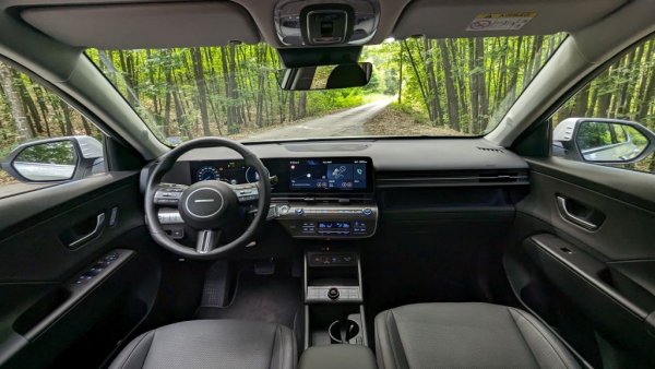 Интериорът е не едно, а поне две-три стъпала над досегашния. Първата Kona беше, откровено казано, доста евтина отвътре. Тази като материали е напълно на нивото на премиум марките, и даже над нивото на някои по-малки техни модели. Все още има някои корави, недодялани пластмаси, но те са на места, където няма да ги забелязвате.